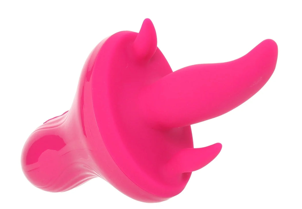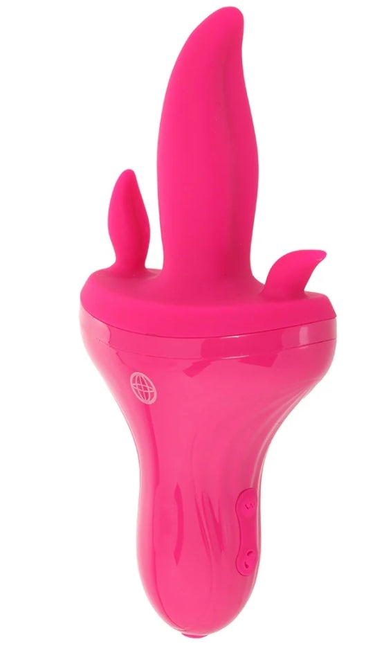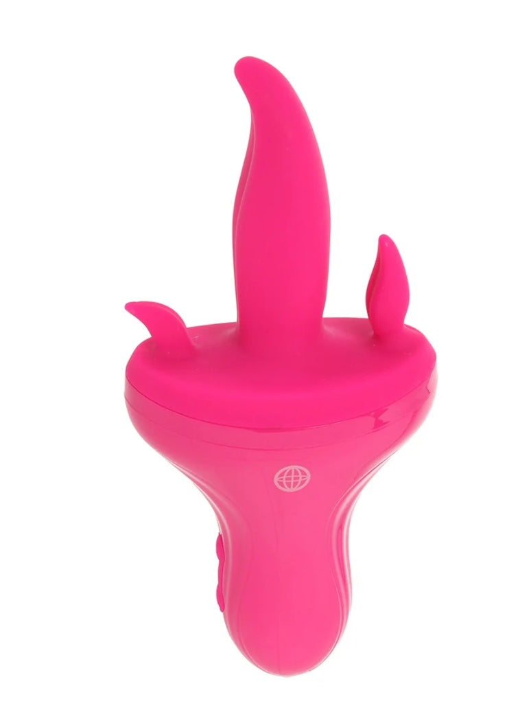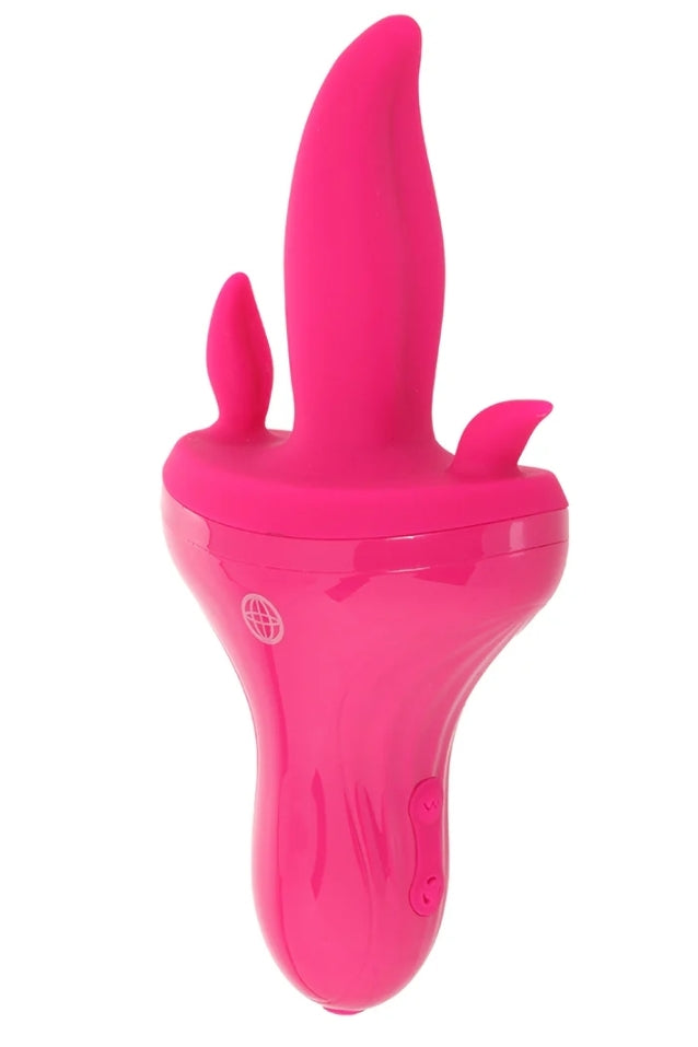 Above a sturdy handle, Holey Trinity's trio of flexible Elite silicone tongues are at your sexy service. The big, penetration-ready one in the middle vibrates while the minis on either side flick and lick clits, butts, etc.