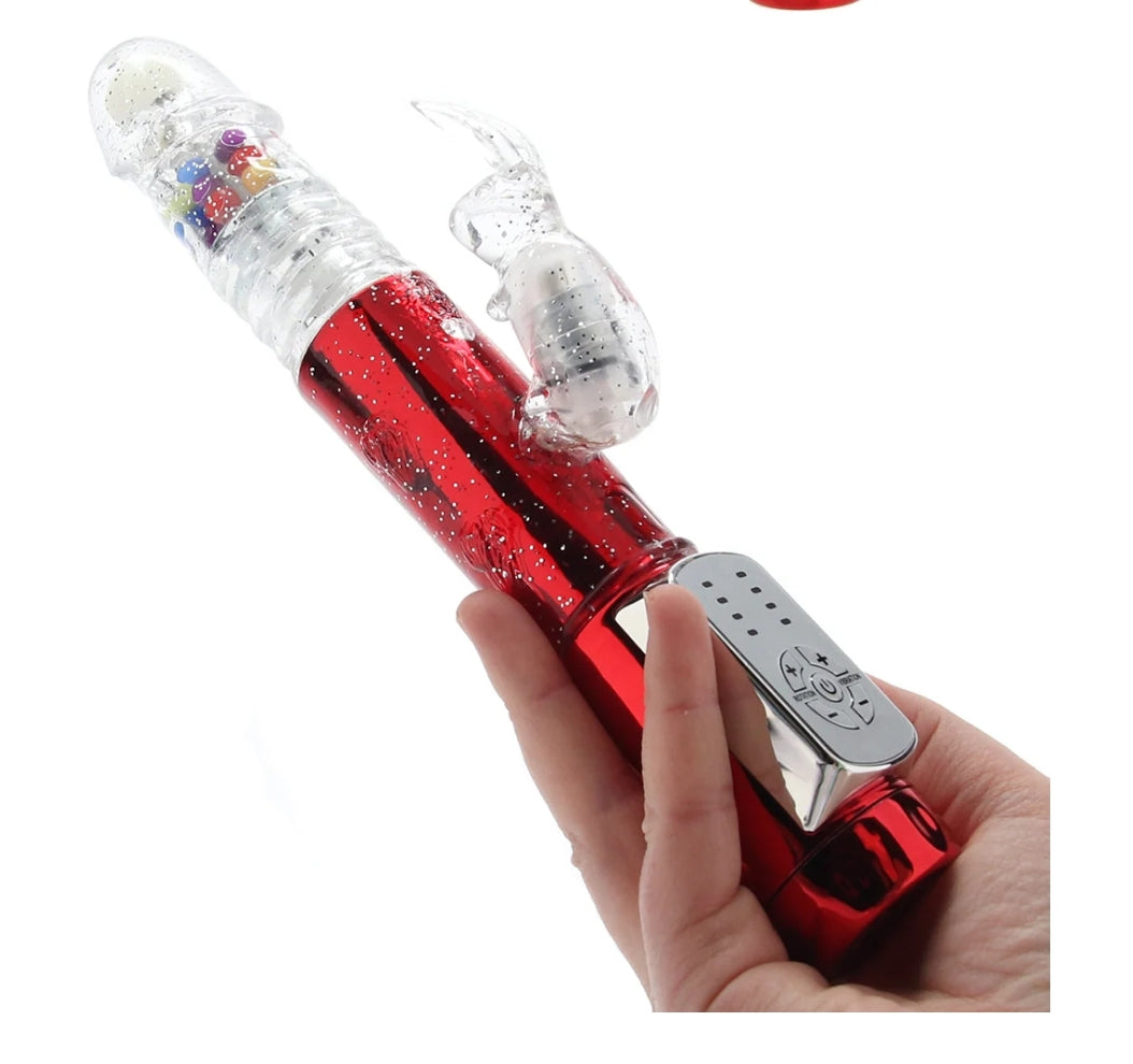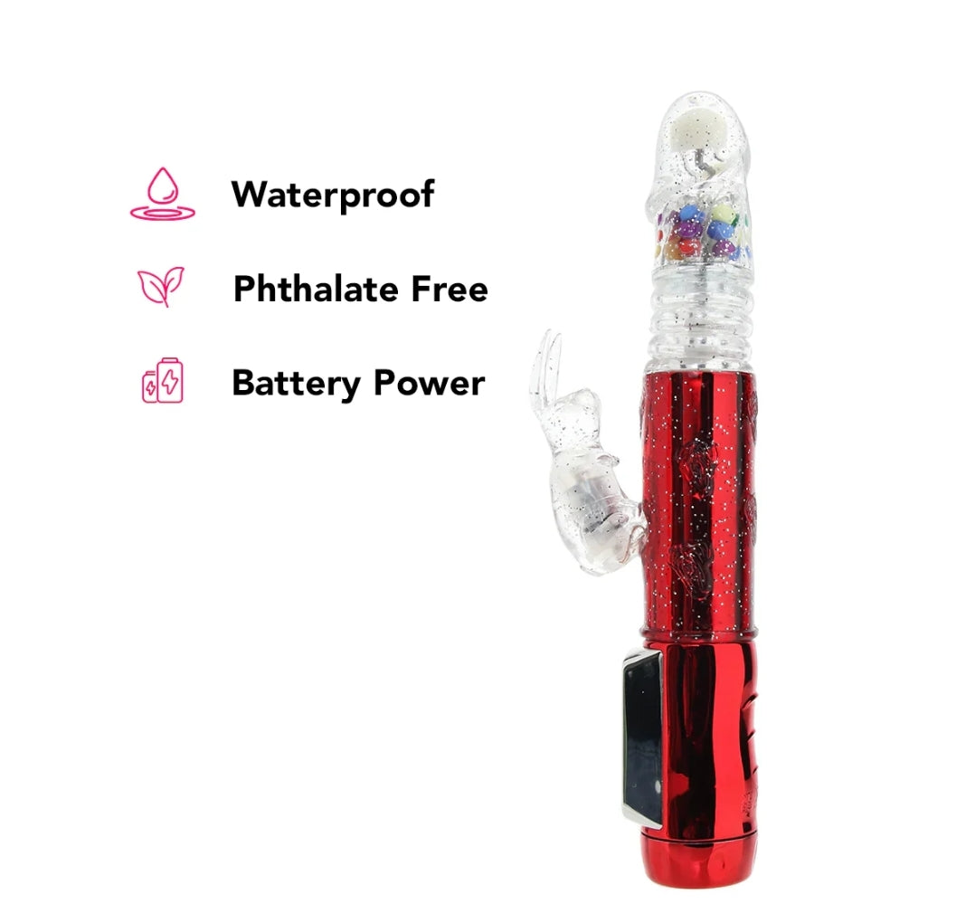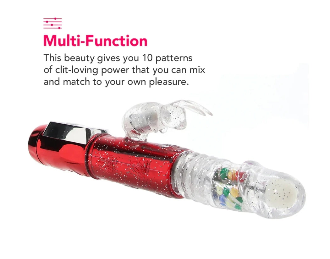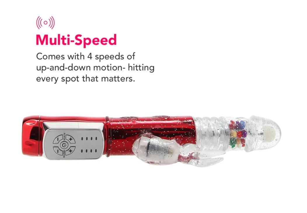 Slide inside and let the colorful beads swirl while the penetrator thrusts in four speeds of up-and-down motion. Up top, the rotating tip zeroes in on your inner hot spots, while the flickery bunny ears on the outside buzz through 10 patterns of clit-loving power. Two separate buttons make it easy to mix, match, and control your orgasmic recipe—solo or with a partner at the controls.